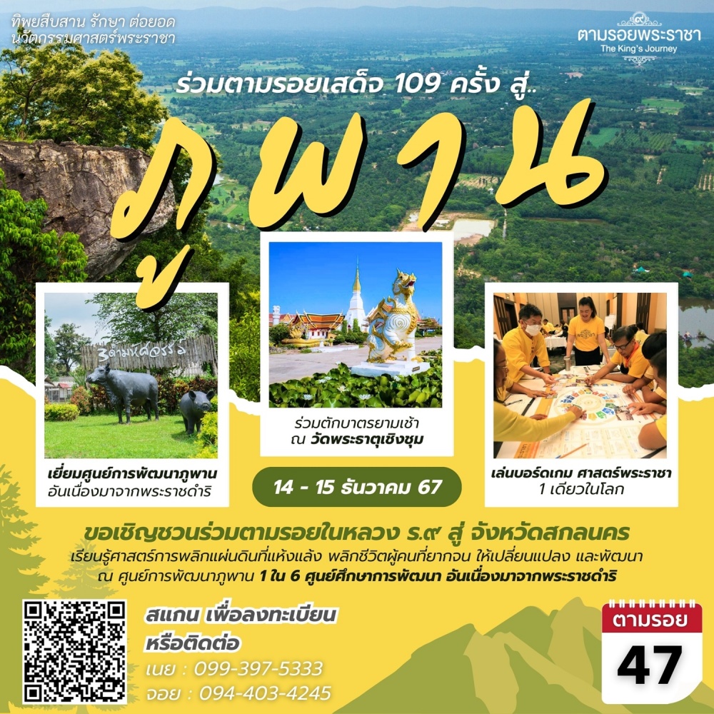 เชิญร่วมโครงการทิพยสืบสาน รักษา ต่อยอด นวัตกรรมศาสตร์พระราชา ครั้งที่ 47 ในวันที่ 14 – 15 ธันวาคม 2567 ณ ศูนย์ศึกษาการพัฒนาภูพานอันเนื่องมาจากพระราชดำริ จังหวัดสกลนคร เปิดรับสมัครตั้งแต่วันนี้เป็นต้นไป สอบถามข้อมูลเพิ่มเติมที่ คุณจารุกัญญ์ โทรศัพท์ 099 397 5333 FB : ตามรอยพระราชา-The King’s Journey